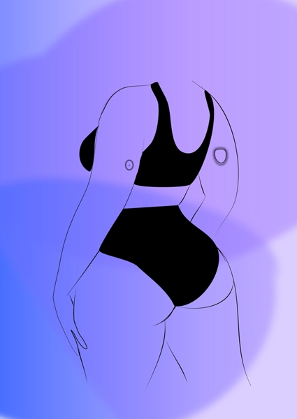 "Tělo diabetu " poster od Lina Eriksson. Silueta v černém spodním prádle vystupuje z magického fialovo-modrého pozadí, kde každý tah představuje neviditelné boje i vítězství. Dva drobné senzory na pažích – minimalistické, ale zásadní značky života s diabetem. Tenhle obraz není jen o těle, je to tichá oslava resilience, co mluví sama za sebe. Pro ty, co rozumí, co se skrývá pod povrchem. Diabetická realita, ale s grácií a stylem.