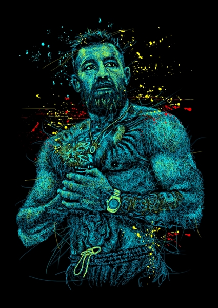 "Conor McGregor" poster od dustynab. Tahle dynamická ilustrace Conora McGregora ztělesňuje jeho nezlomnou energii a bojovného ducha. Světélkující modré tóny kontrastují s temným pozadím, zatímco žluté a červené akcenty působí jako výbuch adrenalinu. Každý detail, od výrazného tetování po intenzivní pohled, dává najevo, že tady nejde jen o sport, ale o životní styl. Pro fanoušky MMA a milovníky výrazného umění je to jasná volba. Taková výzva na zdi.