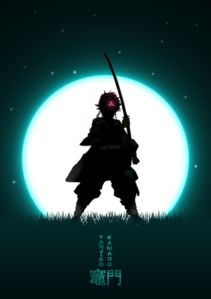 "Měsíc Tanjiro" poster od Faissal Thomas. Silhouette postavy Tanjira Kamada tyčí se před zářící měsíční kulisou, která pulzuje chladným modrým světlem. Tenhle moment zachycuje čistou odvahu a neústupnost – klasický anime hrdina připravený čelit čemukoliv. Ostrý kontrast mezi tmou a zářící lunou vytváří atmosféru, která přímo volá po dobrodružství a akci. Perfektní volba pro fanoušky Demon Slayer a milovníky výrazných vizuálů s japonským nádechem.