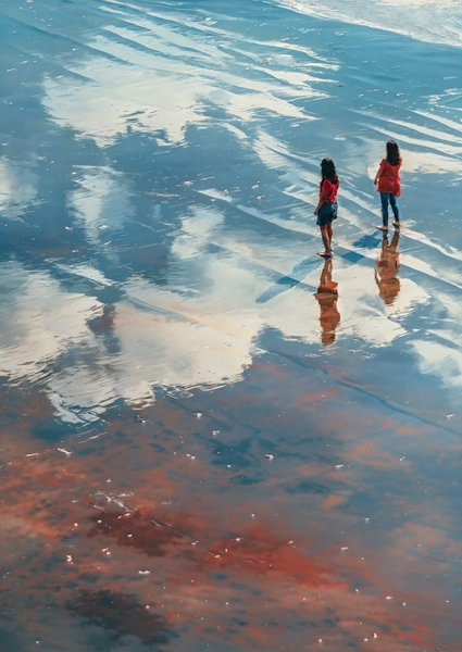"Schody na klidném pobřeží 2" poster od Marcin Szeremet. Dvě postavy v zářivých červených sukních kráčí po lesklém mokrém písku, kde se odráží obloha posetá bílými mraky a nekonečnou modří. Tenhle moment klidu a lehkosti, kdy se voda stává zrcadlem snů, chytí každého, kdo ví, jak zastavit čas – i když jen na chvíli. Není to jen obyčejná procházka po pláži, ale tichá oslava spojení s přírodou a samým sebou. Tak trochu jako kdybys tam právě byl ty.