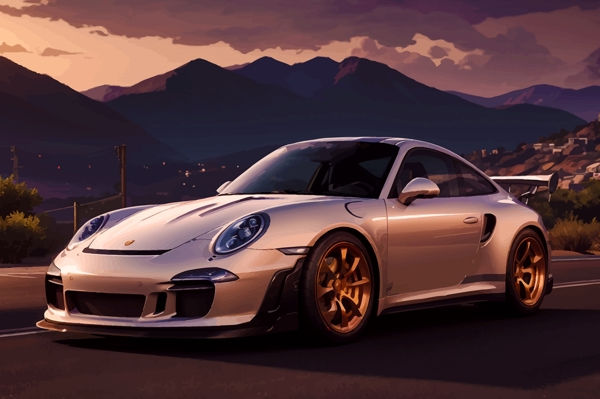 "The Porsche 911 GT3 RS, a masterpiece of automotive engineering, stands majestically against the backdrop of a breathtaking mountain range. Its sleek, aerodynamic design and vibrant color scheme create a stunning contrast with the natural beauty of the landscape."
