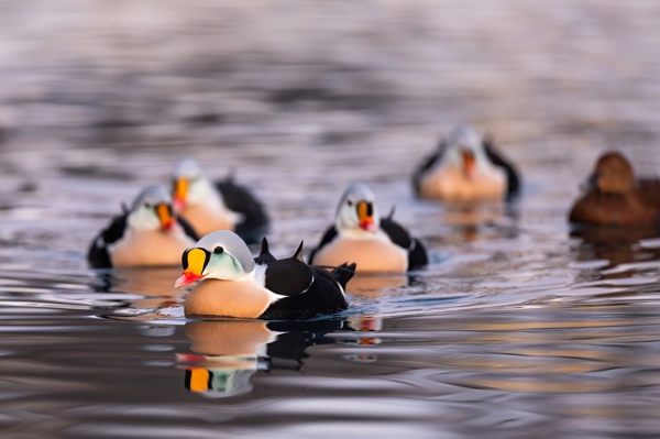 "On this sunny day, the King Eider swim together in their flock. There are mostly males and only one female. The males can be recognized by their beautiful colors. They have a brilliant orange, crown-like knob on the forehead and a coral red bill. The female is more toned down with brown colour. "