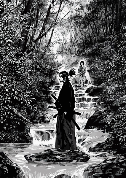 "Tulák" poster od Tic An. Černobílá ilustrace zachycuje samuraje stojícího na kameni u zurčícího potoka, který se klikatí lesní krajinou. V pozadí se objevuje další postava, zahalená v záři světla, což dodává scéně tajemnou atmosféru. Detaily listnatých stromů a tekoucí vody vytvářejí kontrast mezi klidem přírody a napětím přítomnosti bojovníka. Styl evokuje vintage manga s nádechem nostalgie a dobrodružství.