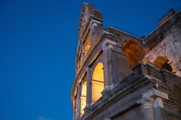 "The close-up of the Colosseum in Rome during the blue hour captures the timeless beauty of this ancient landmark, bathing it in a magical light that brings the history and heritage of this venerable site to life."
