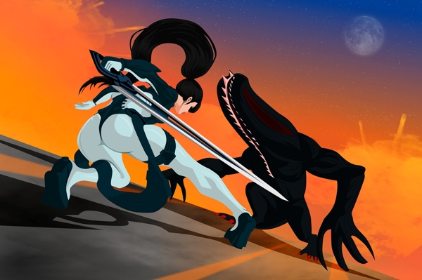 "Eva Hvězdná čepel " poster od misbah dinara. Dynamická scéna zachycuje napínavý souboj mezi neohroženou bojovnicí a temnou bestií v kontrastu s ohnivě oranžovou oblohou a měsíčním svitem. Postava s elegantním mečem v ruce stojí pevně, připravená zasáhnout, zatímco protivník se chystá k útoku. Výrazné barvy a ostré linie vytvářejí pocit rychlosti a napětí, který vtáhne každého fanouška her a fantasy do víru akce. Opravdová jízda pro milovníky dobrodružství a popkultury.