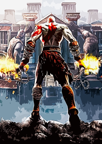 "Bůh války Kratos" poster od FELBERTA 4. Kratos stojí zády a připravuje se na bitvu, jeho svalnatá postava je ozářena plameny z rozžhavených čepelek. Monumentální řecká architektura v pozadí dodává scéně epický rozměr. Tenhle obraz není jen o síle – je to výzva, vzpomínka na legendární dobrodružství plné adrenalinu a nekompromisního boje. Pro fanoušky her a retro stylu je to přesně ten kousek, co rozproudí atmosféru v každém herním koutě.