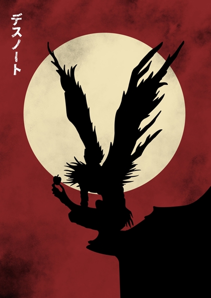 "Umění Death Note" poster od Nando Art. Silueta se vznešenými, divoce roztřepenými křídly vystupuje před obrovským, bledým měsícem na krvavě červeném pozadí. Tohle není jen obrázek – je to vizuální výkřik tajemna a napětí, který okamžitě připomene ikonický svět Death Note. Ostré kontrasty černé a rudé ladí s temnou atmosférou anime, zatímco japonské znaky dodávají autentický šmrnc. Tohle dílo prostě nenechá žádného fanouška chladným.