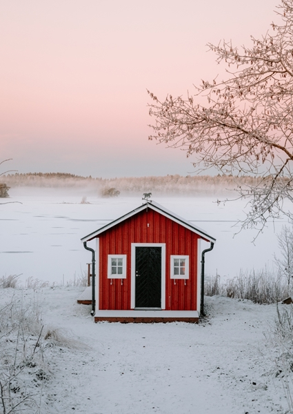 "Červená loděnice v zimní krajině" poster od Amanda Dellien. Malá červená chata stojí přímo u zamrzlého jezera, obklopená sněhem a ledovým tichem, které vyvolává pocit absolutního klidu. Bílé rámy oken a černé dveře vytvářejí kontrast, který okamžitě upoutá pozornost. Ranní růžové nebe a jemná mlha nad krajinou dodávají scéně snovou atmosféru. Ideální pro milovníky zimních momentů, co chtějí kousek Skandinávie přímo doma.