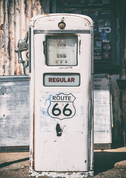 "Běžná čerpací stanice 66" poster od Philippe HUGONNARD. Tahle bílá, ošlehaná pumpa na Route 66 v Arizoně není jen kus kovu – je to malý stroj času. Praskliny a oděrky tu vyprávějí příběhy dálkových jízd a zastávek uprostřed ničeho. Nápis „REGULAR“ a legendární štít Route 66 mluví jasně – tady začíná dobrodružství, které nikdy nezestárne. Pro všechny, kdo milují vintage atmosféru a chuť Ameriky, je tohle přesně ten kousek, co nesmí chybět. Tak trochu retro, tak trochu drsné, ale pořád cool.