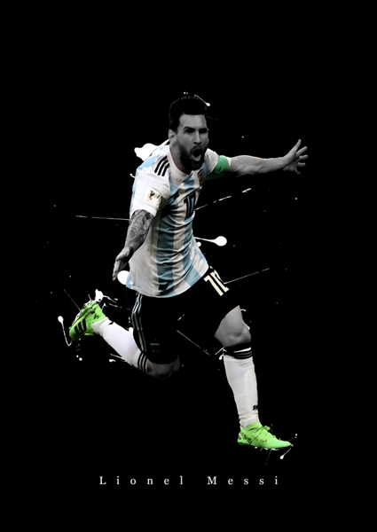 "Messiho fotbal" poster od Dereck. Dynamický portrét Lionela Messiho v argentinském dresu, který vypadá, jako by právě vystřelil gól roku. Černé pozadí nechává vyniknout jeho výraz, pohyb a zářivě zelené kopačky – to je skoro jako kdyby přímo vystupoval z obrazu. Ten moment nadšení a síly, kdy je všechno možné. Pro fanoušky fotbalu a ikonických momentů, co se nezapomínají. Žádný kýč, jen čistá energie a legenda v akci.