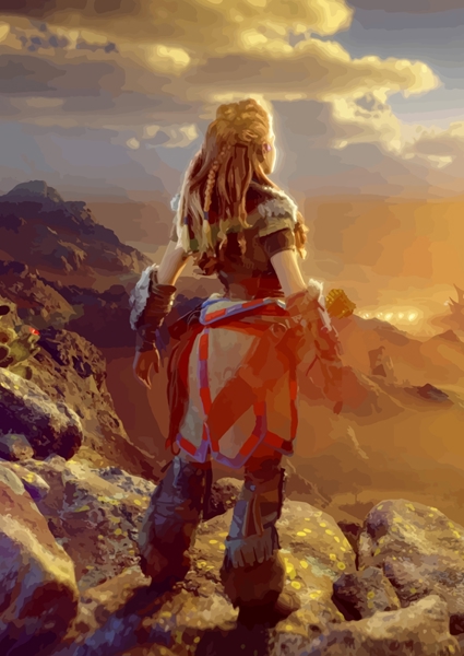 "Válka robotů" poster od Mantab. Silná, sebevědomá, s pohledem upřeným do dálky – Aloy na skalnatém útesu, kde se příroda potkává s technologií a západ slunce maluje oblohu do zlatova. Ten moment, kdy víš, že svět je rozbitý, ale ty jsi připravená ho zas dát dohromady. Horizon Zero Dawn v plné palbě – divočina, stroje a boj o přežití v jednom obraze. Pro fanoušky akčních RPG, co milují dobrodružství, která nenechají chladnými.