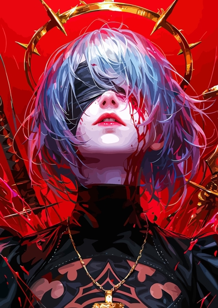 " Plakát zabijáka démonů" poster od berliana lorena. Tento dynamický plakát z anime světa Demon Slayer zaujme výraznou červenou paletou a tajemnou postavou s modrofialovými vlasy a černou páskou přes oči. Krvavé detaily a zlatá koruna s trny vytvářejí kontrast mezi krásou a temnotou. Perfektní pro fanoušky Kimetsu no Yaiba, kteří chtějí do svého prostoru přidat pořádnou dávku napětí a stylu. Skvělý doplněk do sbírky i na zeď.