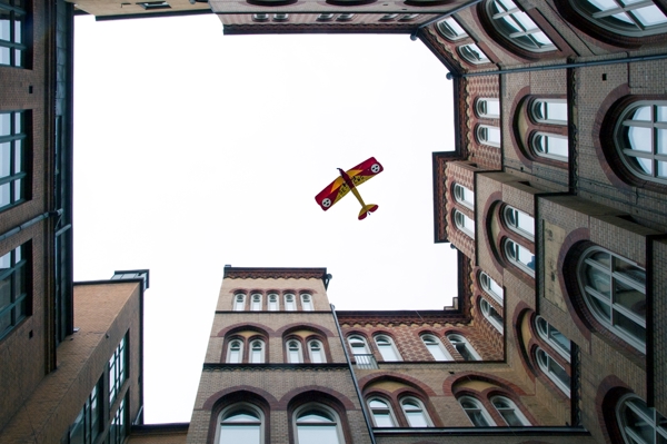 "Proletět" poster od Lars Gudmundsson. Pohled vzhůru do malmöského vnitrobloku, kde se zdánlivě obyčejné cihlové fasády městských domů otevírají nebi. Uprostřed tohoto rámce proletí jasně žluté letadlo De Havilland Tiger Moth – hra světů, která míchá realitu s lehkou dávkou surrealismu. Ten moment, kdy moderní městská architektura potkává nostalgii starého letadla, vytváří nečekanou poetiku všedního dne. Prostor, kde se „The Lion Passage“ stává pozadím pro netradiční vzlet.
