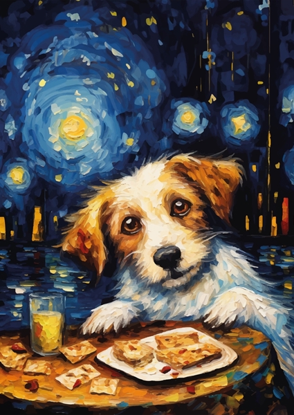 "Psem 003" poster od Van Dog. Roztomilý pes s hlubokým pohledem sedí u stolu plného dobrot, zatímco za ním víří hvězdné víry v barvách Van Goghovy slavné Noci. Kombinace živých modrých a žlutých tónů vytváří snovou atmosféru, která vtáhne do hry světla a stínu. Tento hravý obraz spojuje lásku ke psům s ikonickým uměním a přináší dávku nostalgie i radosti do každého prostoru. Ideální pro milovníky zvířat i umění.