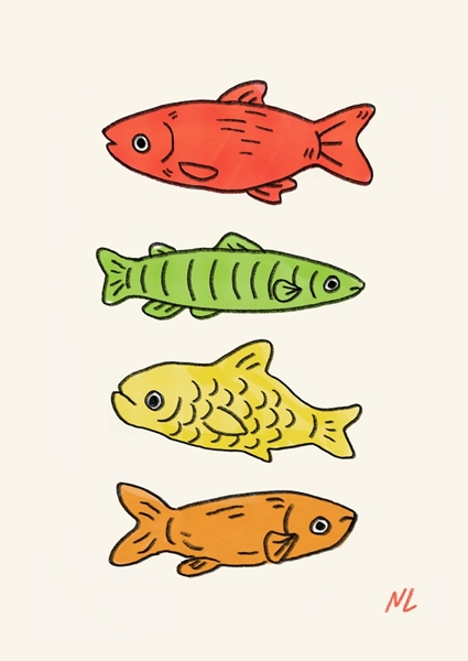 "Kreslená ryba" poster od Linnea Lindgren. Čtyři hravé rybičky v zářivých barvách – červená, zelená, žlutá a oranžová – jako by vypadly z dětské fantazie nebo retro cukrovinky. Každá z nich má svůj jedinečný tvar a výraz, který okamžitě přitáhne pozornost. Ilustrace působí svěže a hravě, ideální pro oživení dětského pokoje nebo jako zábavný akcent v interiéru. Barvy jako z dávných sladkostí, co nikdy nevyjdou z módy.