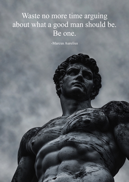 "Marcus Aurelius Stoický citát" poster od Vars. Černobílá fotografie sochy zachycuje sílu a odhodlání, které jako by vyzařovaly z kamene samotného. Nad postavou se vznáší slova Marca Aurelia: „Waste no more time arguing about what a good man should be. Be one.“ Tohle není jen citát, ale výzva k akci – přestaň přemýšlet, začni být. Minimalistický styl a dramatické nasvícení spolu vytvářejí atmosféru, která inspiruje k sebereflexi a vnitřní síle. Skvělý doplněk pro každého, kdo chce mít po ruce dávku stoické moudrosti.