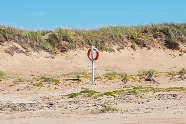 "V bezpečí u moře" poster od Åsa Söderlund. Moře, písečné břehy, písečná pláž a záchranná bóje