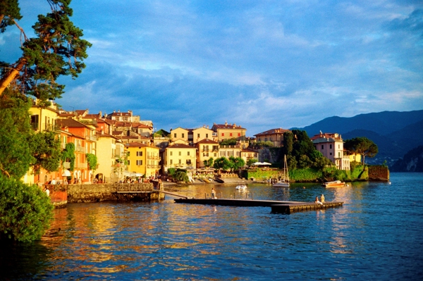 "Varenna is a picturesque village on the shores of Lake Como in northern Italy. At the end of the evening, the last rays of sunlight penetrate under the dark cloud cover and give the village a warm golden glow. The analog photo has a vintage look with fine grain and bright colors."
