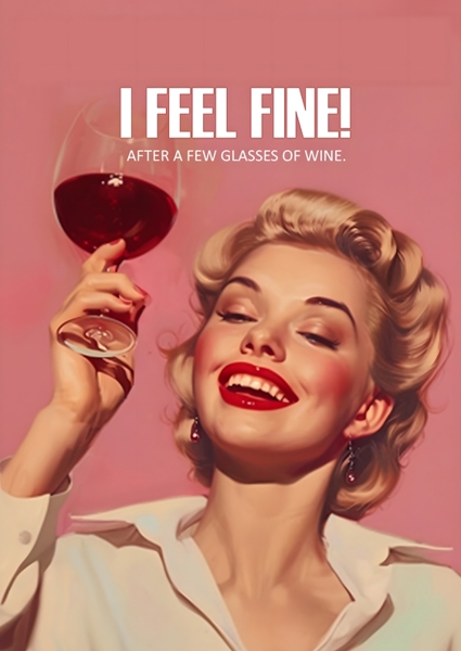 "Pěkné s vínem " poster od Peter Russberg. Žena s úsměvem, který říká „vše je v pohodě“, drží sklenku červeného vína vysoko nad hlavou. Retro styl 50. let září v každém detailu – od vln vlasů po jasně červené rty. Růžové pozadí a odvážný text „I FEEL FINE! AFTER A FEW GLASSES OF WINE.“ dávají celé scéně hravý, lehce drzý nádech. Ideální do kuchyně nebo baru, kde je víno nejen nápoj, ale i moment radosti. Prostě víno + styl = pohoda.