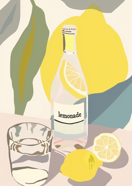 "This Poster is featuring a bottle of lemonade adorned with the word "LEMONADE" in bold black lettering. The flat illustration style, combined with pastel colors and geometric shapes, creates a delightful and modern aesthetic. "