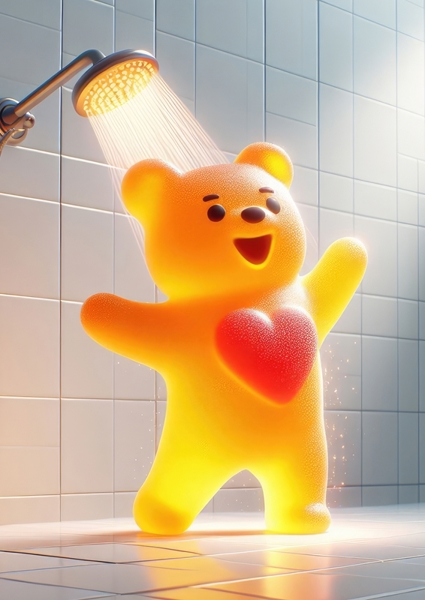 "Zamilovaný gumový medvídek" poster od Karl Faber. Zářivě žlutý gumový medvídek si užívá sprchu, která ho doslova rozsvěcuje. S velkým červeným srdcem na hrudi a roztomilým úsměvem přináší toto pop-art dílo dávku radosti a hravosti. Perfektní do dětského pokoje nebo kuchyně, připomíná, že i obyčejné chvíle mohou být magické. Prostě osvěžující dávka štěstí, která rozveselí každý kout.