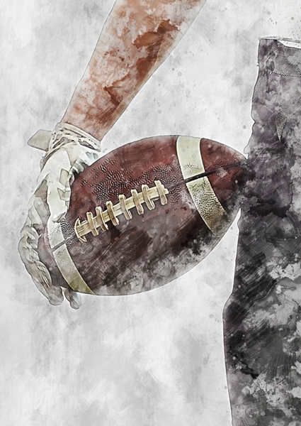 "Americký fotbal - Míč" poster od Mateo. Fotbalový míč pevně sevřený v rukavici hráče – detaily tkání a švů jsou téměř hmatatelné. Jemné kouřové stíny a rozmazané pozadí vytvářejí atmosféru napětí a pohybu, jako by se právě chystal rozjet zápas NFL. Ten okamžik mezi klidem a explozí, kdy všechno může začít. Pro fanoušky amerického fotbalu i milovníky sportovního umění, co chtějí mít kousek hry pořád na dosah.
