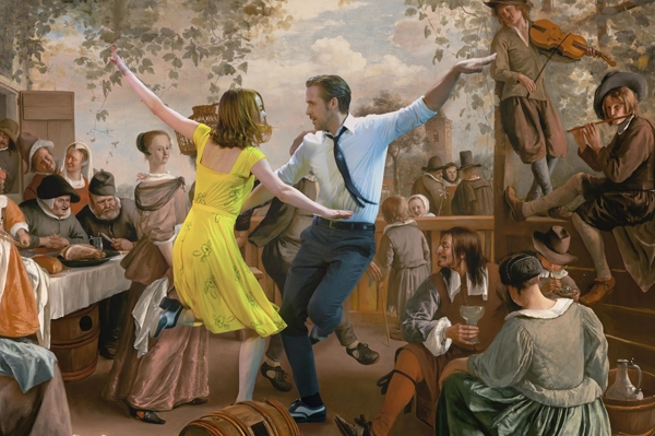 "Party Land" poster od Dikhotomy. Veselá scéna z 15. století dostává nečekaný hollywoodský twist díky postavám Mii a Sebastiana z filmu La La Land, které tancují uprostřed renesanční oslavy. Olejomalba kombinuje klasickou atmosféru s moderním šarmem – žluté šaty, kravata v pohybu a rytmus, co prostupuje davem hudebníků a veselých hostů. Je to hra s časem i stylem, kde se filmový sen potkává s historickou radostí. Tak trochu jiný večírek, co baví a nutí se usmívat.