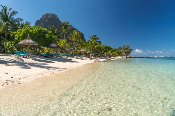"tropical beach at the Dinarobin Beachcomber Hotel and Le Morne Brabant, Le Morne peninsula, Black River, Mauritius, Africa "