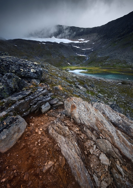 "Inclement weather moving in over the peak of the Helags mountain. The glacial meltwater forms a small lake, lending some soft greenery to the rocky foreground."