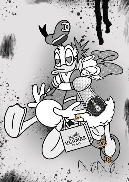 "XOXO Kachny" poster od Tomas Härstedt. Černobílá ilustrace představuje Daisy a Donalda v nečekaném high-fashion objetí, kde luxusní značky jako Chanel, Hermès a Gucci hrají hlavní roli. Detaily jako kabelka Hermès a zlaté doplňky dodávají dílu šmrnc, zatímco lehce chaotické pozadí s inkoustovými skvrnami podtrhuje moderní streetartový vibe. Tahle kombinace ikon Disney a světa módy není jen o stylu – je to hra s konvencemi, která baví a nutí přemýšlet. Skvělý kousek pro ty, kdo chtějí trochu nadsázky i luxusu v jednom.