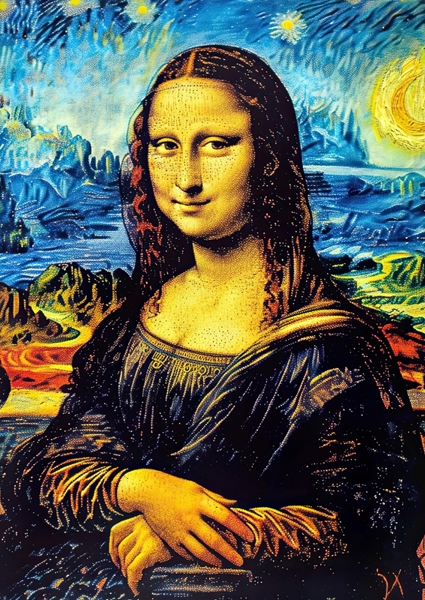 "A captivating blend of Da Vinci's Mona Lisa with Van Gogh's Starry Night, this artwork merges two iconic masterpieces into a single, mesmerizing composition. The serene smile of Mona Lisa is set against the swirling, star-filled sky, creating a dreamlike fusion of classic art."