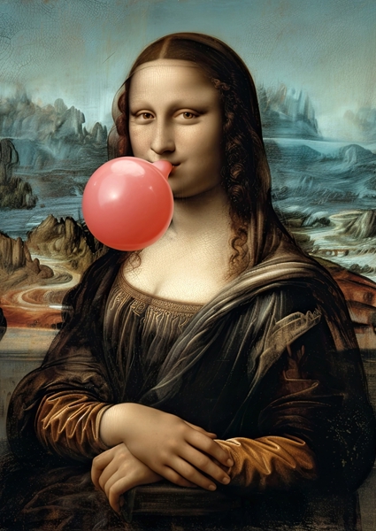 "A playful and whimsical twist on the classic Mona Lisa, this artwork captures the iconic figure blowing a bubblegum bubble. Perfect for those who appreciate a blend of timeless art with a pop-culture twist."