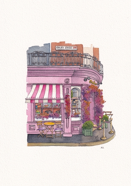 "Růžová čajovna v Londýně" poster od Urban Anna. Malý růžový čajový salon v Londýně, který vypadá jako vystřižený z pohádky. Jemné akvarelové detaily oživují sladkosti za výlohou – dortíky, koláče a cupcaky, které lákají k zastavení. Pruhovaná markýza a kvetoucí popínavé rostliny dodávají scéně hravý a příjemný nádech. Perfektní místo, kde si představit klidné odpoledne s šálkem čaje, s lehce nostalgickou a zároveň moderní atmosférou. Taková ta londýnská cool roztomilost, co prostě potěší.