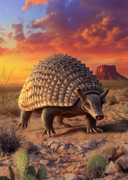"This image captures an armadillo's grand journey across the vast desert expanse at sunset."