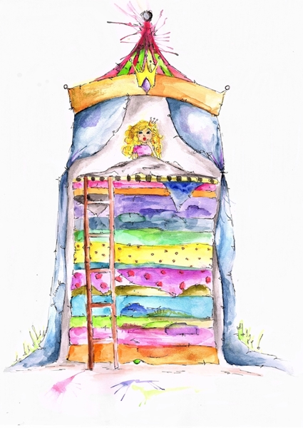 "A depiction of the fairy tale with the princess who slept on a pea."