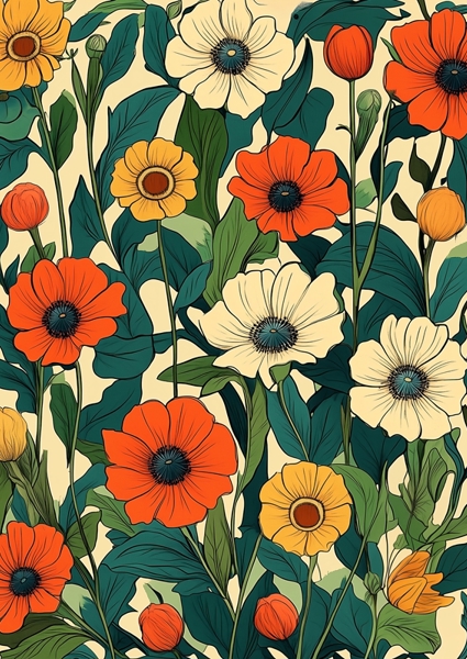 "Pole vlčích máků" poster od Annika persson. Svítivý koberec vlčích máků a květin vesele tančí na plátně, jako kdyby se přímo třásly ve větru. Výrazné červené, slunečně žluté a jemné bílé tóny se mísí s bujnou zelení listů a vytvářejí živý, téměř pulsující obraz plný energie. Každý detail petalů je pečlivě zpracovaný, což dává dílu hloubku a hravost. Perfektní pro oživení interiéru a přidání jiskry přírody do každé místnosti.