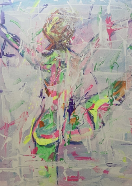 "Tančí nahý" poster od Jasmine Herhold. Exploze barev a pohybu v této akrylové malbě zachycuje nahou tanečnici, která se zdá být v absolutní svobodě. Abstraktní postava je tvořena neonovými a pastelovými odstíny, které splývají v divokém, téměř chaotickém rytmu štětců. Dílo působí jako spontánní oslava života, kde každý tah vyzařuje energii a nezávislost. Formát 30 x 40 cm je ideální pro milovníky moderního umění, které mluví bez slov a zároveň nutí k zamyšlení.