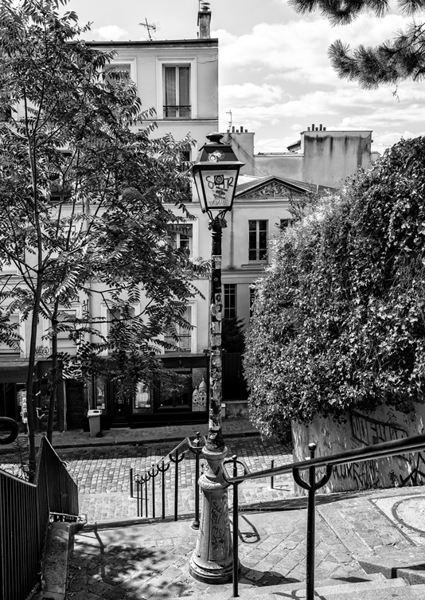 "Ikonické pařížské schodiště" poster od Philippe HUGONNARD. Černobílý snímek ukazuje slavné schodiště v srdci Montmartre, kde každý stupeň nese stopy minulosti a příběhy umělců i snílků. Vintage lampa uprostřed scény jako strážce času dodává celé kompozici dávku nostalgie a lehké tajemnosti. Úzké uličky a staré pařížské domy vytvářejí atmosféru, která vás vtáhne do retro elegance a nezaměnitelného kouzla francouzské metropole. Ideální pro milovníky autentických momentů a klasického stylu.