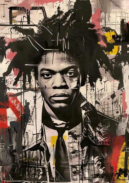 "This powerful piece channels the essence of Jean-Michel Basquiat, capturing his unique urban energy with bold, abstract strokes. A homage to a master of contemporary art, it radiates the raw spirit of rebellion and creativity."