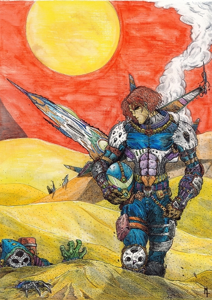 "Fantasy - Koncept" poster od Marco Teixeira. Vypálená poušť pod dvěma žhavými slunci – taková scéna, kde se mísí fantasy s drsnou sci-fi. Hrdina v brnění, co vypadá spíš jako mix vesmírného rytíře a přeživšího z apokalypsy, nese záhadnou kouli a s cigaretou v ruce lámavě kráčí přes písek. Záhady kolem něj – kostry, tajemné stvoření, kouř stoupající do nebe. Mars? Jasně, ale s pořádnou dávkou fantazie a nečekaných příběhů z neznáma. Perfektní pro ty, co chtějí víc než jen obrázek – chtějí příběh.
