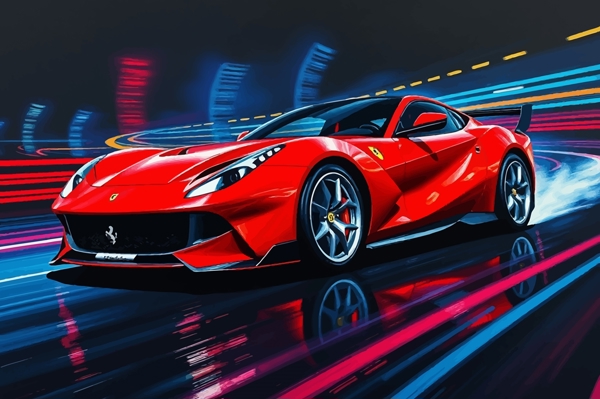 "The Ferrari 812 Competizione roars to life on a neon-lit circuit, its vibrant paint shimmering under the pulsating lights. With breathtaking speed and precision, it carves through the corners, leaving a trail of brilliance. This supercar embodies power, elegance, and adrenaline in every curve."