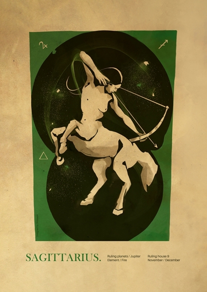 "Střelec Lukostřelec Umění #250661" poster od Dion Gem. Centaur s napnutým lukem a šípem se vznáší v temně zeleném prostoru, který kontrastuje s béžovým pozadím. Tohle není jen další horoskop na zeď – je to výzva k dobrodružství a odvaze, naplněná energií ohnivého znamení Střelce. Jupiter a listopad s prosincem tu nejsou náhodou, dodávají dílu kosmický rozměr. Ideální kouskem pro ty, kdo chtějí do interiéru přidat trochu mystiky a vintage stylu, co zároveň řekne: „Jsem tu, a jdu na to!“