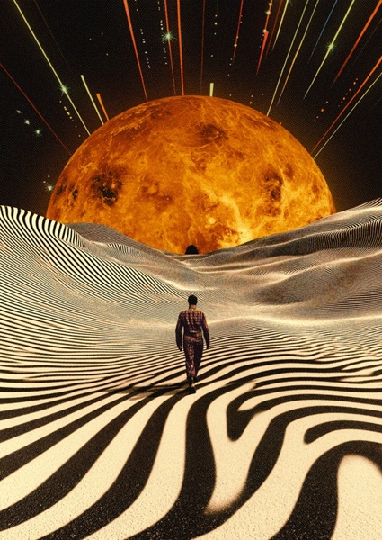 "Na cestě za uměním" poster od Taudalpoi. Vstupte do vizuální jízdy, kde retro vlny optické iluze tančí pod obrovskou planétou s žhavým povrchem. Postava kráčí surrealistickou krajinou připomínající zvrásněnou černobílou krajinu, která se zdá být zároveň nekonečná i hypnotická. To není obyčejná procházka – je to výlet do psychedelického vesmíru plného tajemství, kde se setkává vintage styl s kosmickou neznámou. Pro fanoušky sci-fi snů a vizuálních mindfucků.