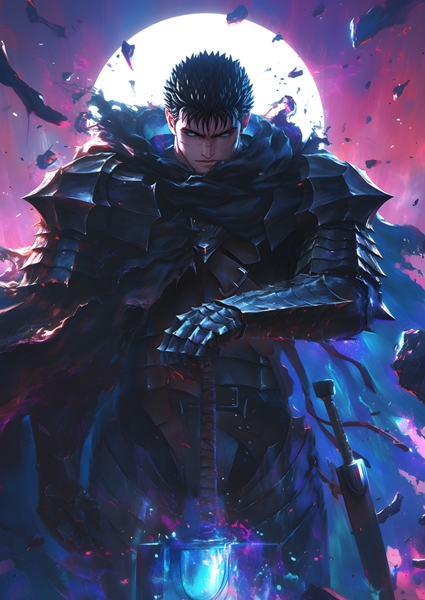 "Vnitřnosti zuřily" poster od Hachico. Temný válečník v černé zbroji stojí uprostřed víru barev a plamenů, které kontrastují s jeho chladným, nepoddajným pohledem. S mečem pevně v rukou a tmavým pláštěm vlající kolem něj působí jako lovec, který nikdy neodpočívá. Tohle není jen fantasy postava – je to symbol síly, odhodlání a neúprosné vůle, jakou zná každý fanoušek anime a japonské kultury. Guts z Berserku, připravený čelit jakékoliv bouři.
