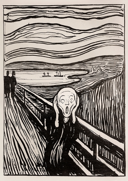 "The Scream by Edvard Munch is a powerful painting of fear and anxiety. In black and white, the screaming figure and chaotic background enhance feelings of confusion and loneliness. The absence of color emphasizes the raw emotion."