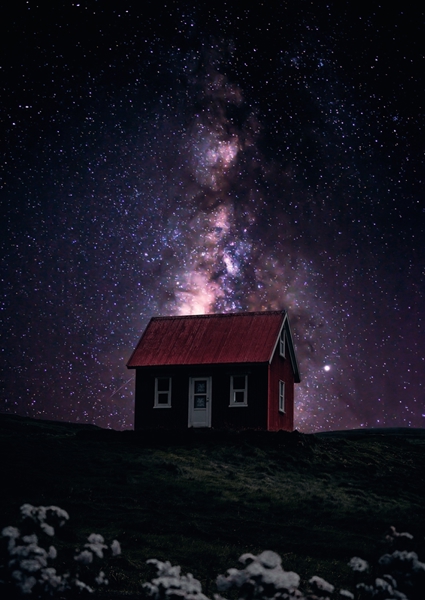 "This artwork captures the serene beauty of a solitary house under a vibrant night sky, symbolizing solitude and cosmic wonder. With its ethereal charm, it pairs well with minimalist and rustic interior trends, perfect for spaces seeking a touch of quiet contemplation and inspiration."
