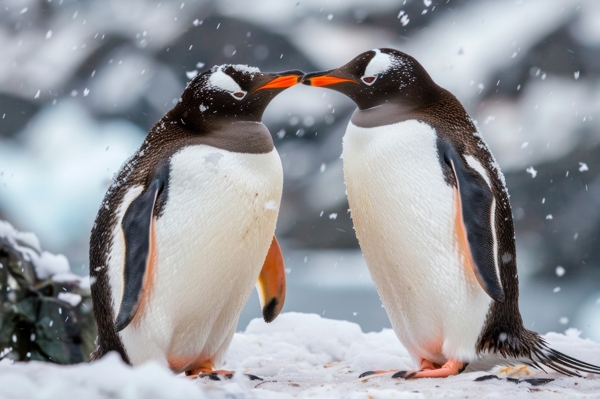 "couple of beautiful penguins looking at each other with snow falling on their faces"