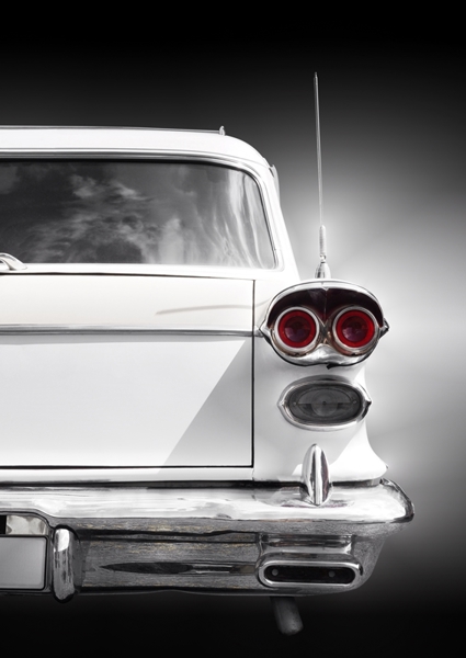 "US Auto Chieftain Safari 1958" poster od Beate Gube. Detailní záběr na zadní část amerického automobilu z roku 1958, který okamžitě přenese zpět do éry, kdy design znamenal odvahu a styl. Zářivě bílý lak kontrastuje s výraznými červenými koncovými světly, které jako by blikaly tajemstvím minulých cest. Chromované detaily podtrhují eleganci a robustnost té doby. Není to jen auto, je to kus historie, který mluví jazykem vintage Ameriky – prostě kultovní klasika, která nikdy nevyjde z módy.