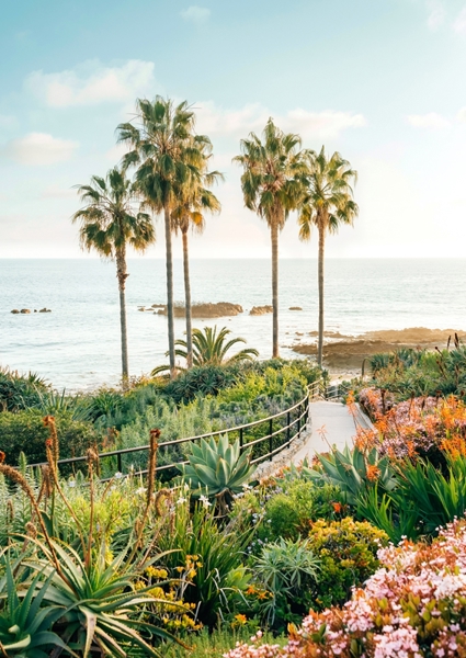 "A stunning art print that captures the beauty of the seaside and nature, right on your walls. This design features majestic palm trees, a winding pathway surrounded by lush greenery and blooming flowers, and a breathtaking ocean view."