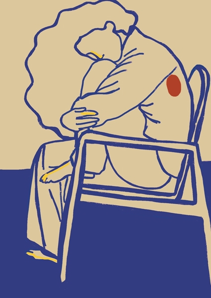 "Žena sedící držící nohu" poster od Tainah Negreiros. Minimalistické umělecké dílo zachycuje ženu sedící na židli, která objímá své ohnuté nohy. Tenké modré linie definují její postavu a židli, zatímco jednoduché barvy – béžová, modrá a jedna výrazná červená tečka – vytvářejí kontrast a hloubku. Celková kompozice působí klidně, ale zároveň vyvolává pocit introspekce a zranitelnosti. Skandinávský nádech v čistotě tvarů a barev přináší svěží moderní atmosféru do každého interiéru. Ale tak… někdy si člověk prostě potřebuje sednout, obejmout se a být.